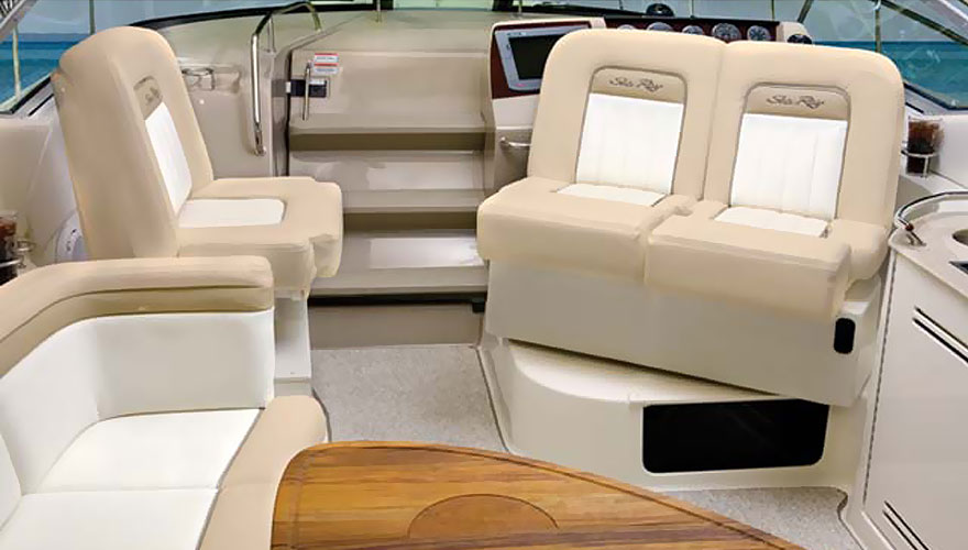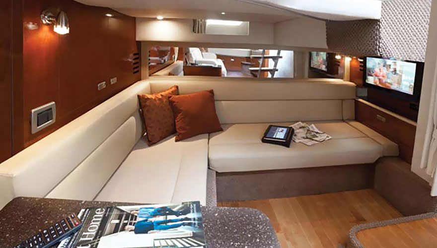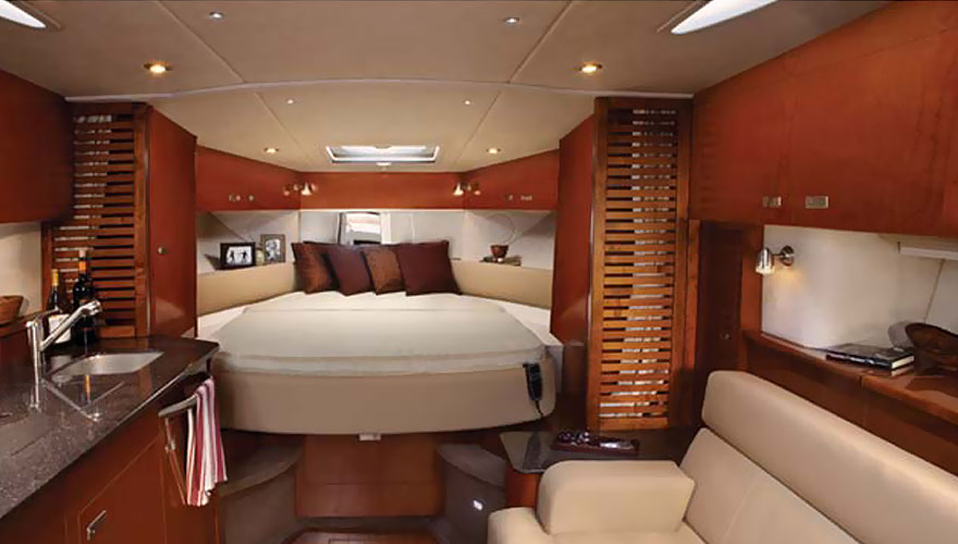SeaRay 370 Sundancer空間非常寬敞,是Sport Cruiser系列的經(jīng)典之作。不論您是朋友聚會或是家庭出游,這款游艇都是您完美的選擇??蛇x用汽油或柴油發(fā)動機,讓您自己選擇最適合您的發(fā)動機。V型船艙的睡床,沙龍區(qū)可容納六個人。加上廚房設施齊全,配有平板電視和DVD播放器。